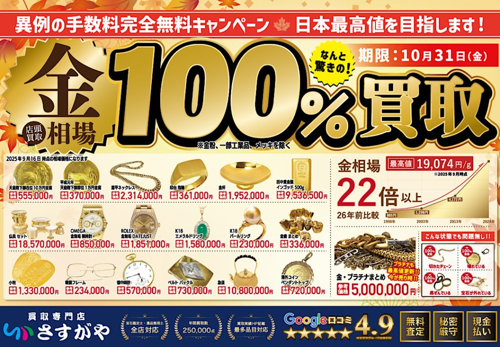 今、金がかつてない高値を付けているのをご存知ですか? この歴史的な価格更新を記念し、当店では10月限定の特別買取キャンペーンを実施いたします。
