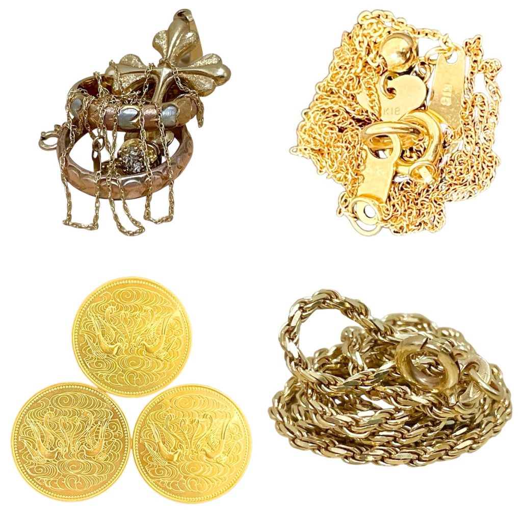 ネックレスやリング、ピアス、コイン、金歯など様々なものに金は使われております!